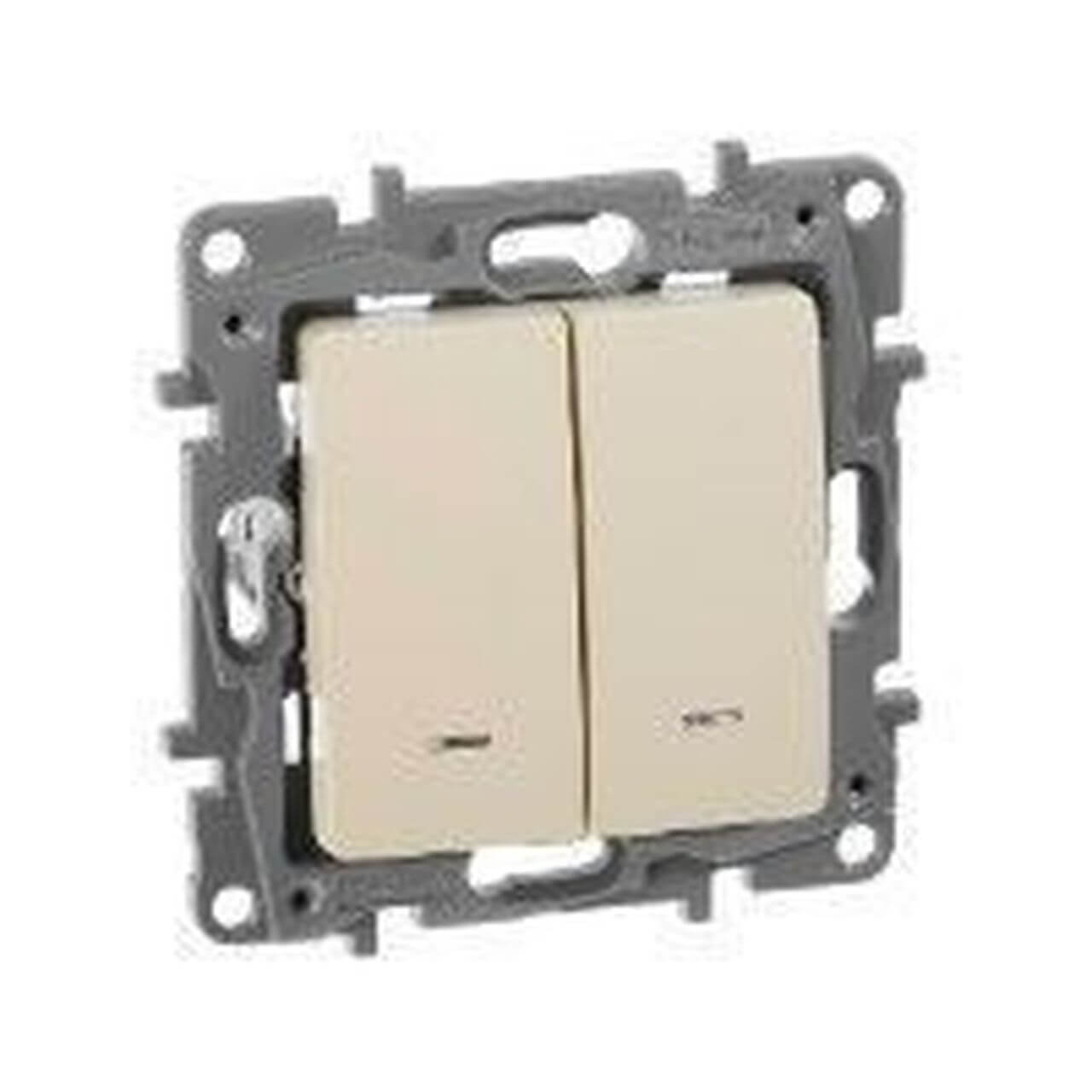 Переключатель двухклавишный с подсветкой - удобное решение для слабоосвещенных помещений, позволяет легко найти выключатель в ночное время. поставляется с лампой. Поставляется с лампой. В зависимости от способа подключения лампа может работать как подсветка или индикация. Цвет: слоновая кость.