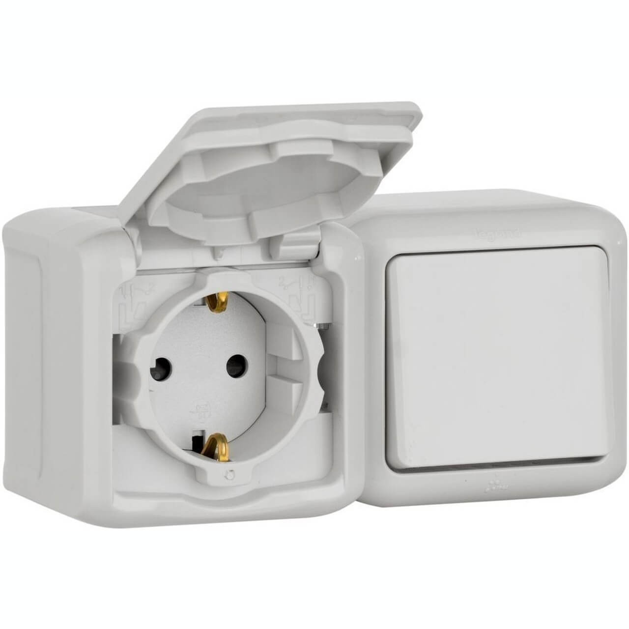 Выключатель + Розетка 2P+E нем. стд. со шторками Legrand Quteo, накладной