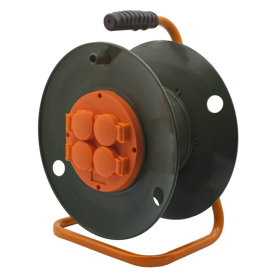 Катушка без провода ЕК-06-300 с 4 встроенными розетками, предназначена для удобного хранения и перемещения силового провода электрического удлинителя. Изделие оснащено устойчивой металлической опорой, практичной ручкой для переноски и устройством для быстрого сматывания шнура питания удлинителя. Имеет контакты заземления и степень защиты IP54.