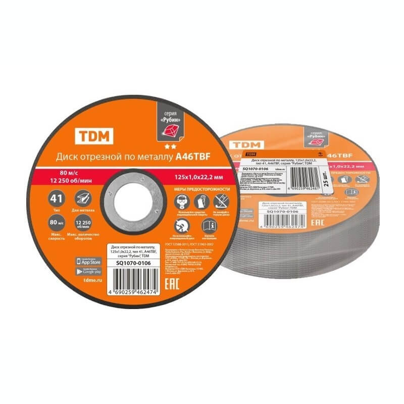 Вы можете купить Диск отрезной по металлу, 125х1,0х22,2, тип 41, A46TBF, серия Рубин, TDM недорого в компании «Энергоснабмонтаж» – электрооборудование в Барановичах по доступным ценам.