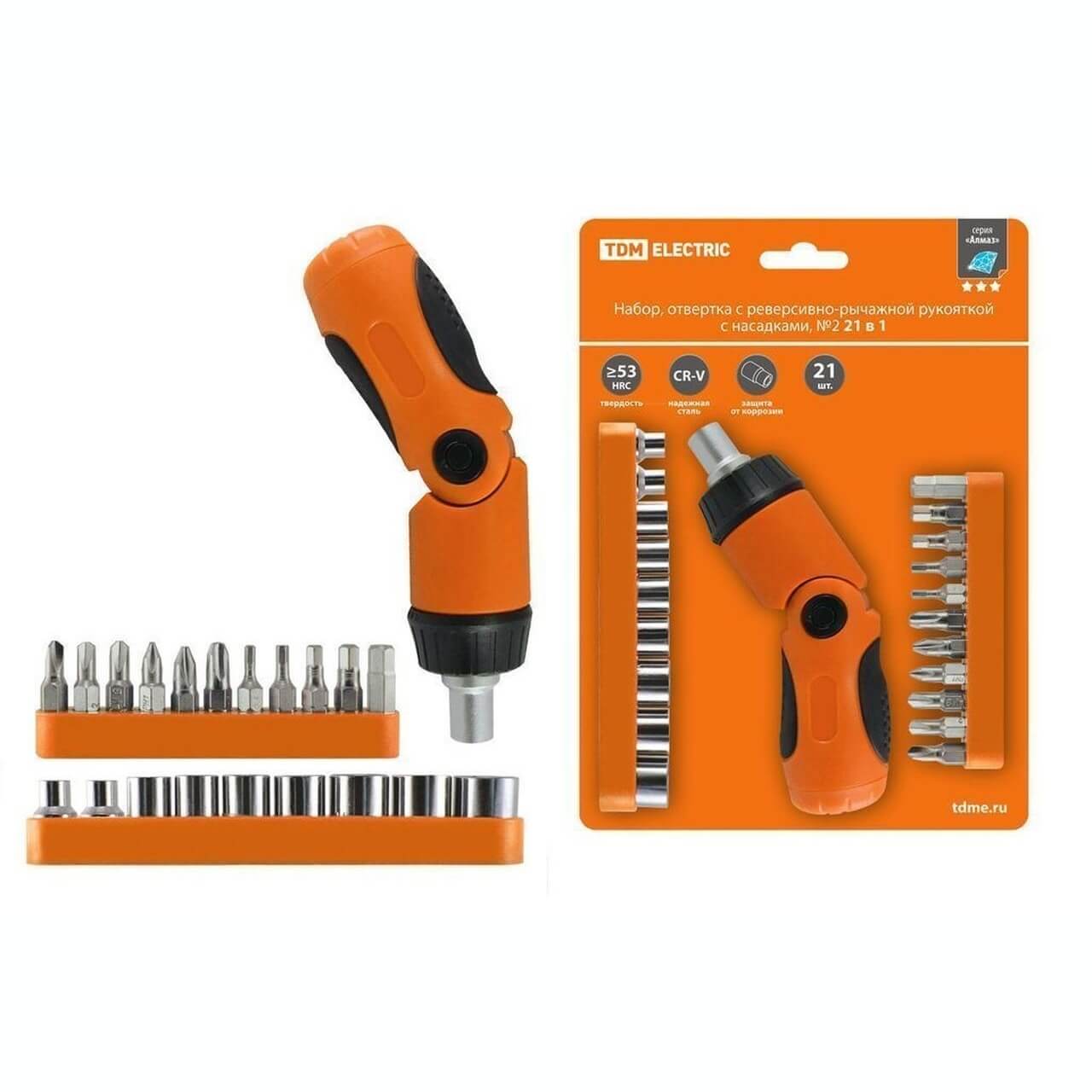 Набор, отвертка с реверсивно-рычажной рукояткой с насадками, №2, 21 предмет Алмаз TDM