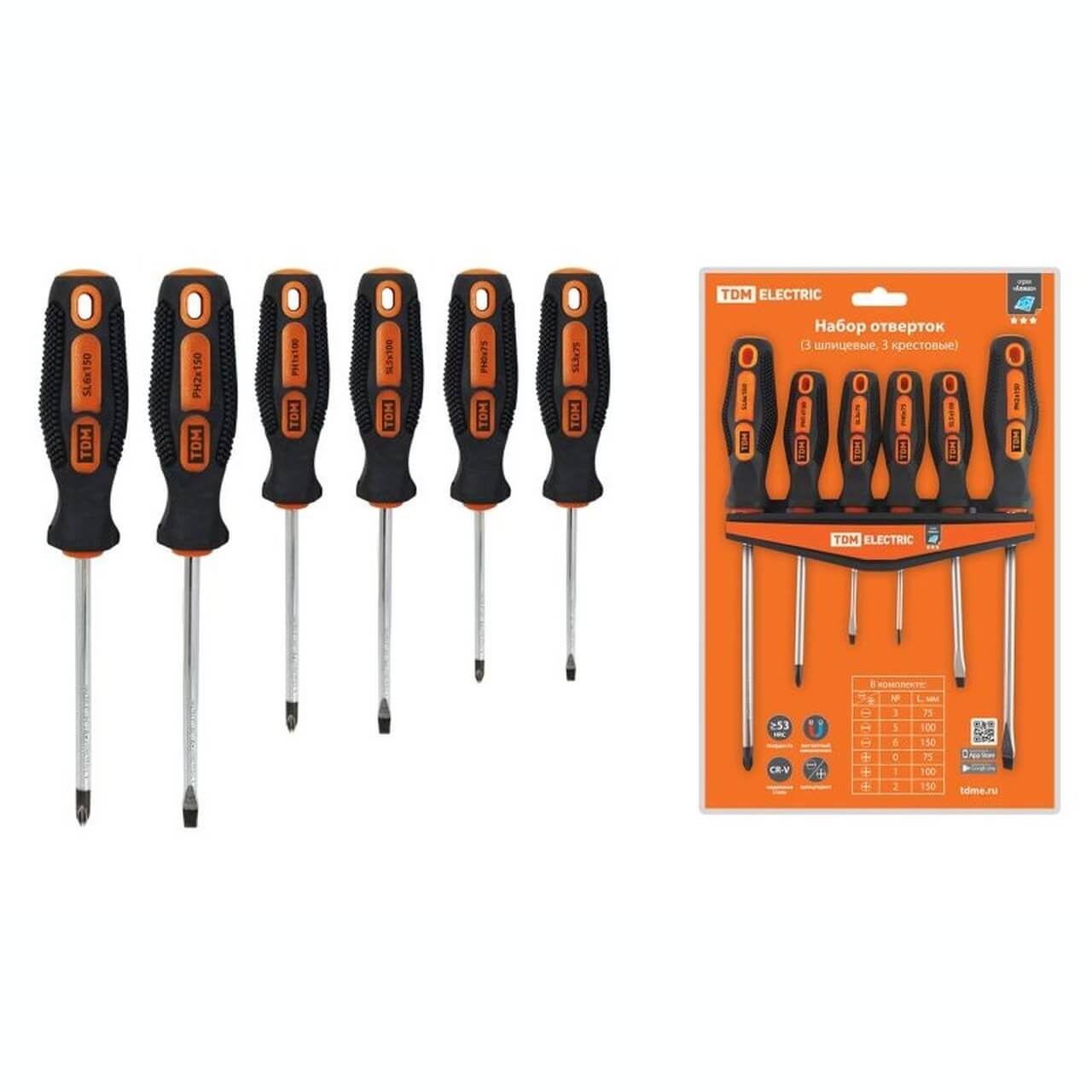 Набор отверток 6 шт.: SL:3×75;5×100;6×150, PH:0х75;1×100;2×150 (пласт. держатель), CR-V «Алмаз» TDM SQ1013-0207