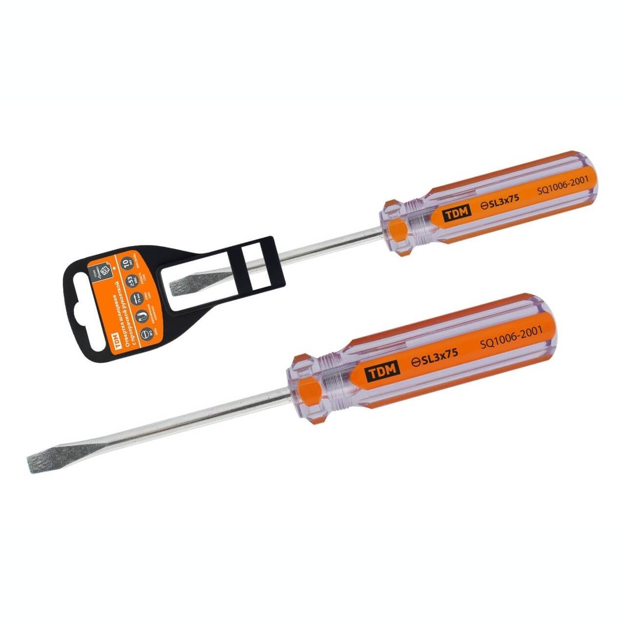 Отвертка шлицевая, прозрачная рукоятка, углеродистая сталь, тип SL3.0 x 75 мм, серия Гранит TDM