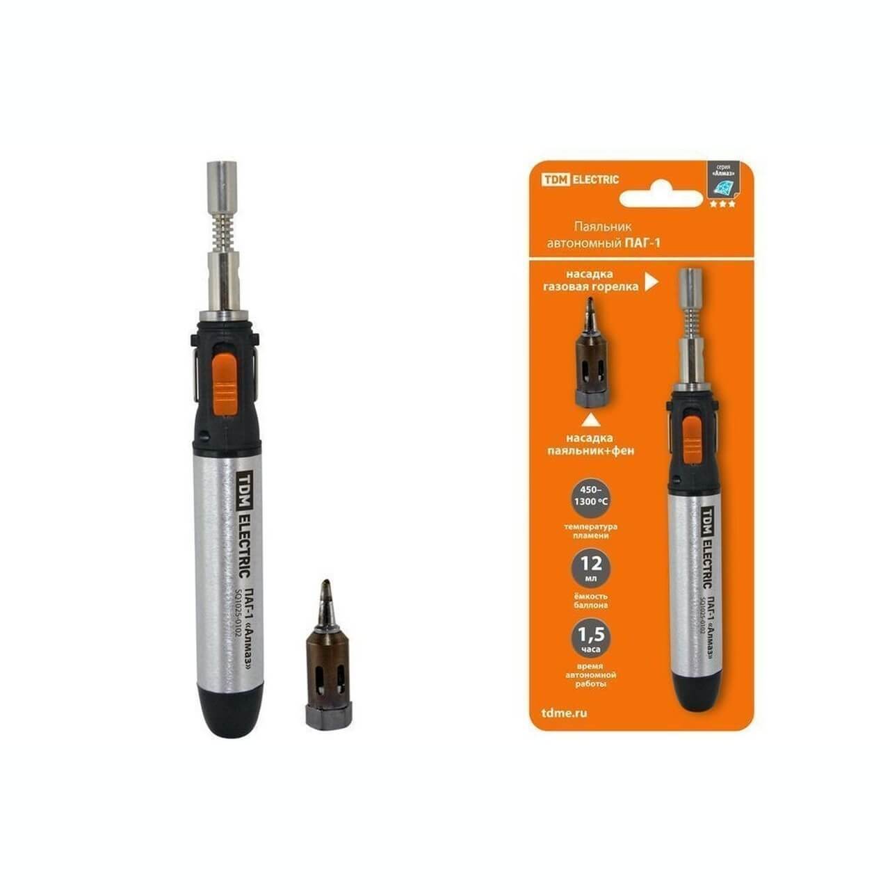 Паяльник автономный газовый ПАГ-1, (3 наконечника: жало, резак, фен), 12 мл Алмаз TDM