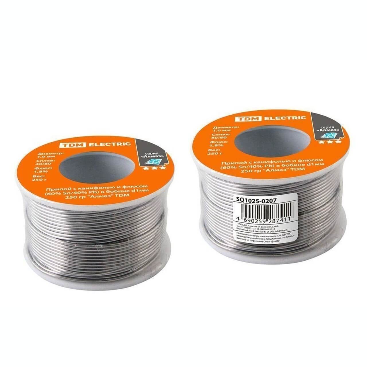 Припой с канифолью и флюсом (60% Sn/40% Pb) в бобине d1мм 250 гр Алмаз TDM Назначение Для пайки проводников, электронных плат и компонентов. Для закрепления элементов на плате. Припой содержит и олово, и канифоль.