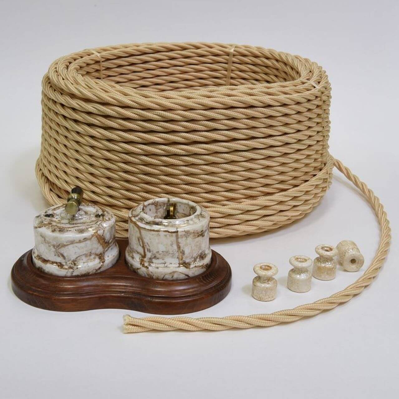 Назначение:Провод предназначен для монтажа наружной проводки в стиле ретро.Керамический изолятор предназначен для крепления витого провода к стене при прокладке открытым способом.Применение:Жилой сектор.Коттеджные поселки.Объекты социально-культурного разнчения.Конструкция:Провод с медными жилами, с изоляцией из поливинилхлоридного пластиката, с защитной оплеткой по каждой жиле из полиэфирных нитей.Материал изоляторов – электрофарфор.Преимущества:Ретро провод производится в России согласно ГОСТам и стандартам качества.Ретро провод идеально подходит для деревянных домов, где провода нельзя монтировать в стены.Возможна прокладка в строящихся деревянных домах, нет необходимости ждать усадки дома.Активно применяется для дизайнерских решений в стиле «Эко»