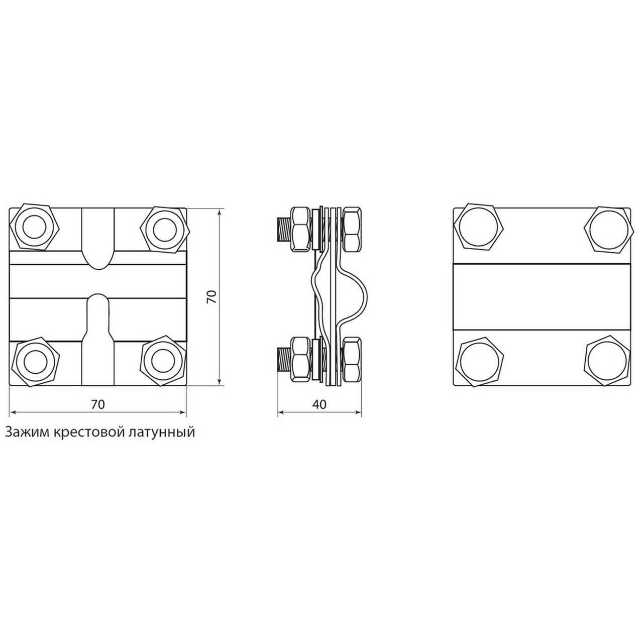 Зажим крестовой3пластины – сталь с латунным покрытием, болты – стальзажимы – 70х70 мм; болты – М8х35 (4 шт.)соединение штыря заземления с проводником (круглого сечения: 25-50 мм2 квадратного сечения: от 2х20 до 3х25 мм)