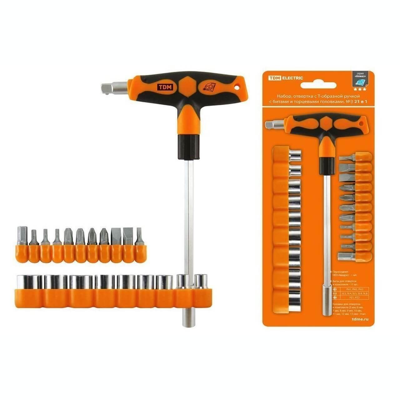 Набор, отвертка с Т-образной ручкой с битами и торцевыми головками, №3, 21 предмет Алмаз TDM
